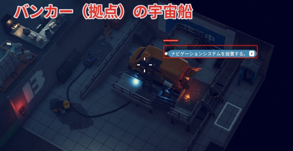バンカー(拠点)の右側の通路から宇宙船にアクセスできます。装置を設置しましょう!