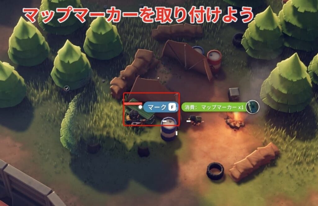 テント付近の荷物にマップマーカーを取り付けましょう。
