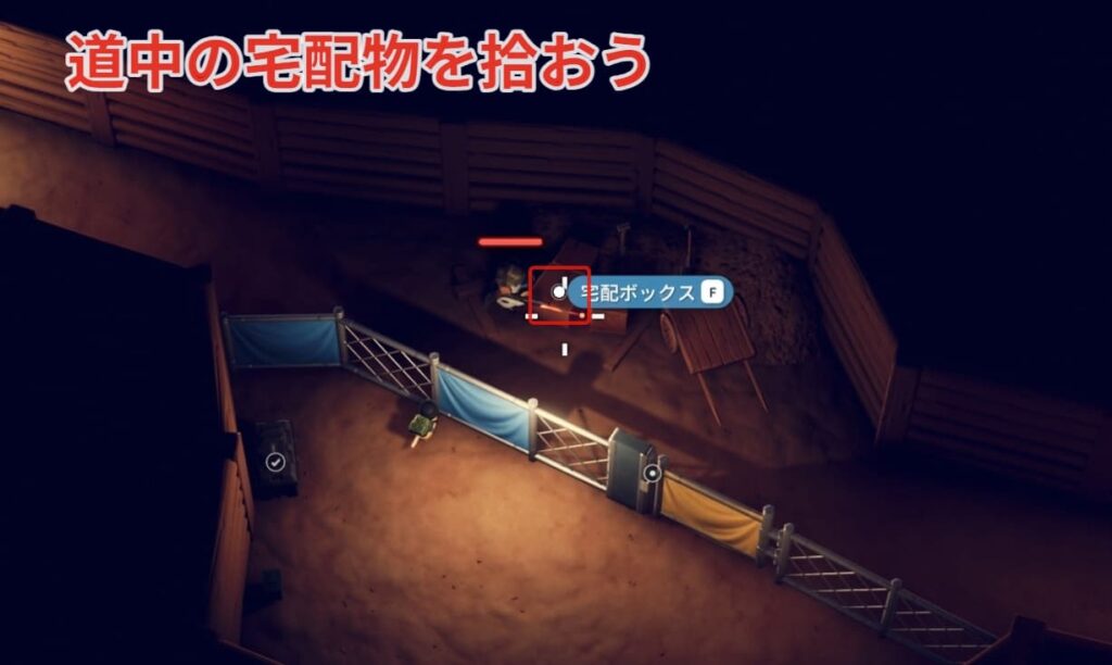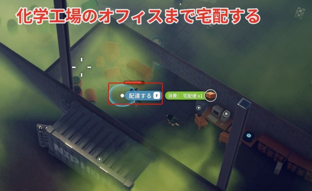 倉庫エリア【地下倉庫】→農場町【化学工場のオフィス】まで帰還せずに宅配する必要があります。