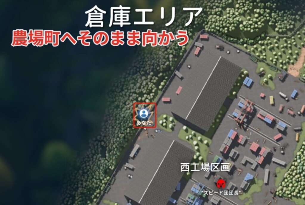 今回はバンカー(拠点)に戻ると失ってしまう為、そのまま農場町へ向かう必要があります。