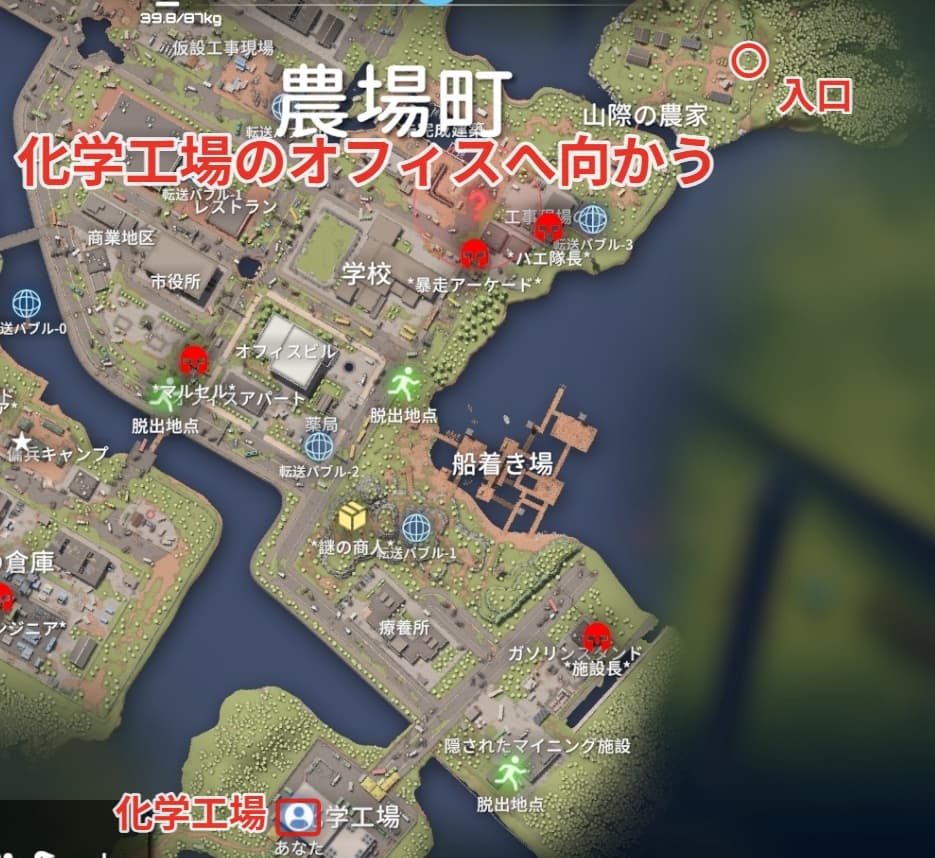 農場町へ着いたら南方向へ向かい化学工場へ向かいましょう。