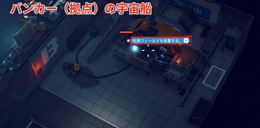 バンカー(拠点)の右側の通路から宇宙船にアクセスできます。装置を設置しましょう!