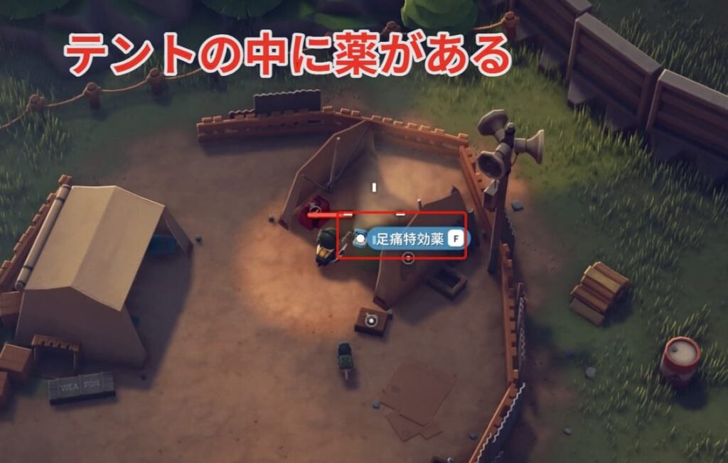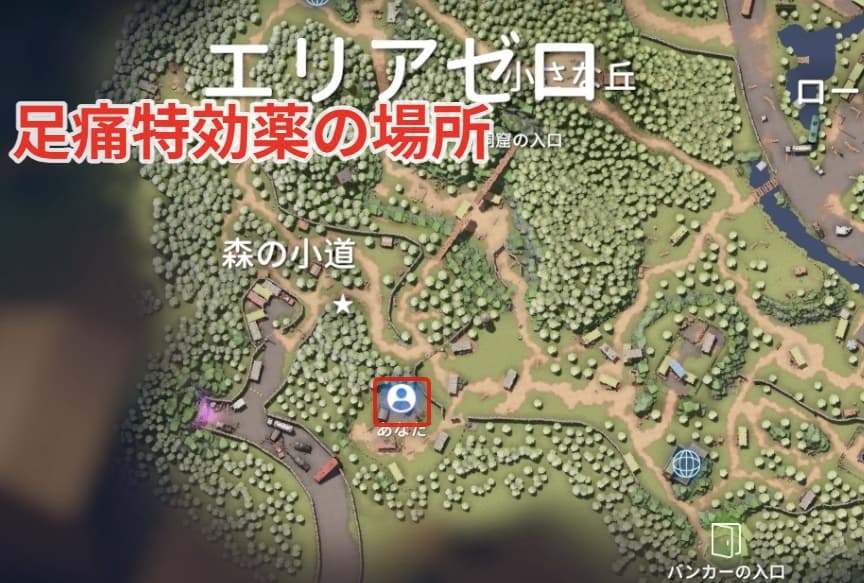 足痛特効薬は森の小道とバンカーの入口の間にあるキャンプにあります。