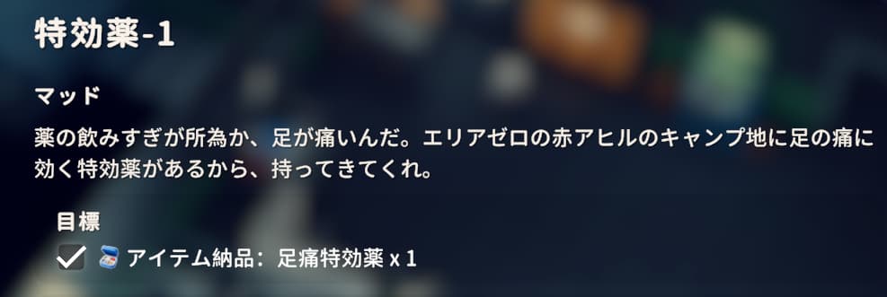 エスケープフロムダッコフの【クエスト:特効薬-1】について紹介していきます。