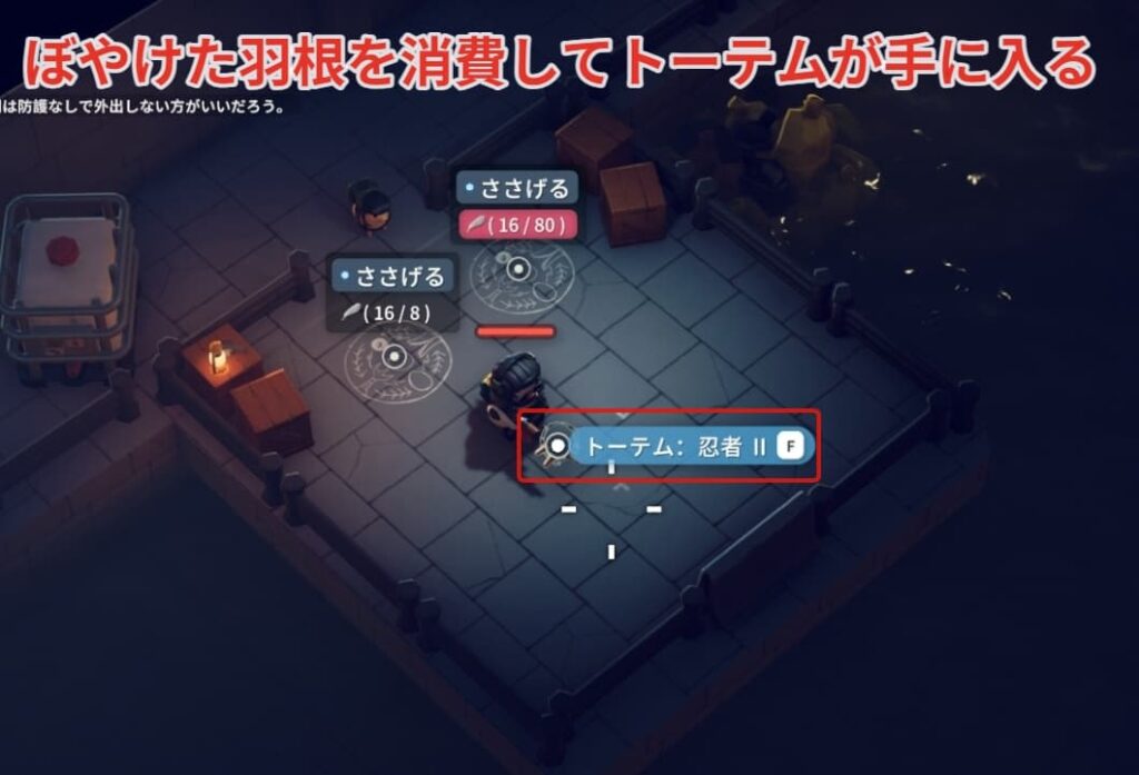 トーテムガチャができるので敵を倒したら羽根を回収すると良いでしょう。