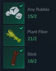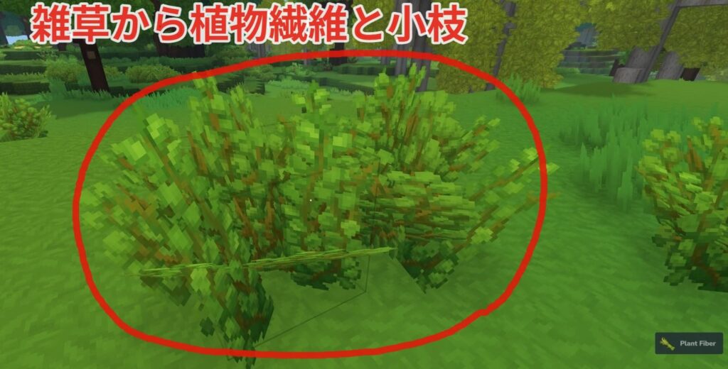 ゲームが始まったら序盤のツール素材になる【小枝・ガレキ・植物繊維】を集めていきましょう。