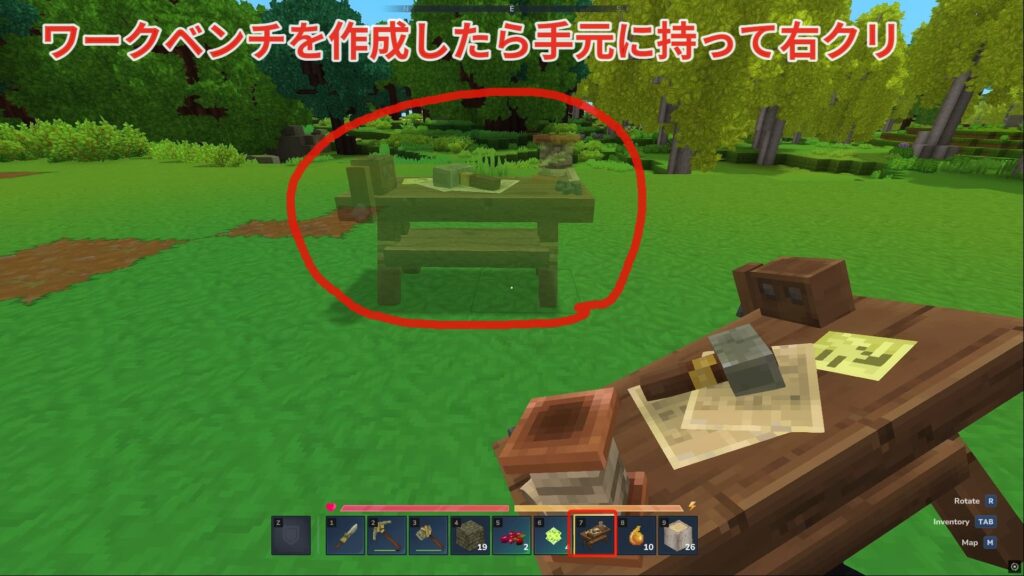 木と石が集まったらワークベンチを作成し、手に持って右クリで配置しましょう。