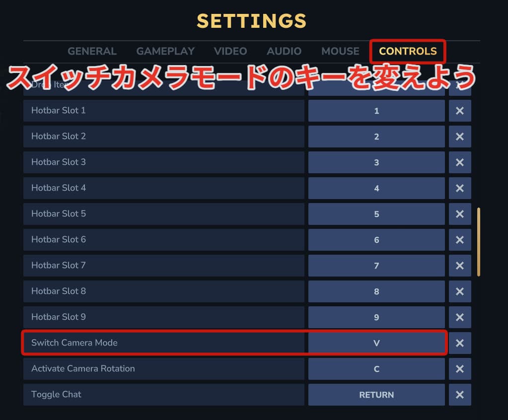 初期設定のVキーを変えたい方はセッティング→コントロールからスイッチカメラモードのボタン配置を変えましょう!