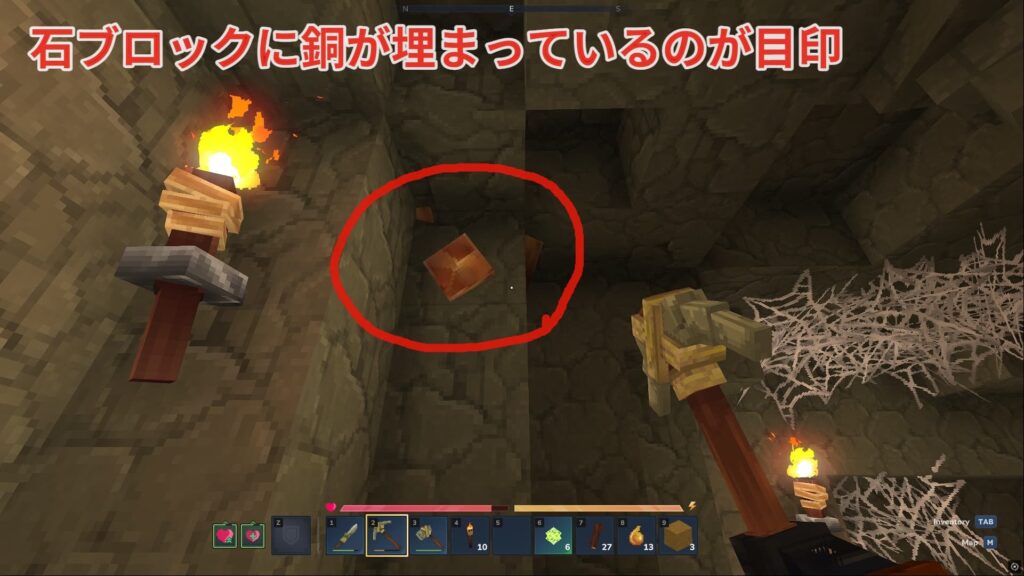 空洞を進むと石ブロックに銅が埋まっているブロックを見つけることがあると思います。