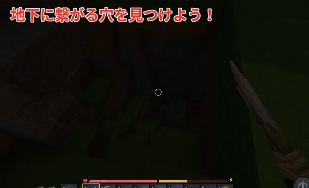 地上を探索していると、地下に繋がっている空洞が見つかります。そこから下に降りていきましょう!