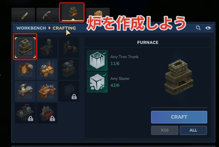 銅鉱石を持って帰ってきたらワークベンチで炉を作成しましょう。