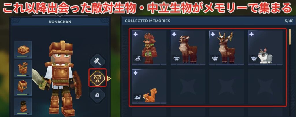 メモリー機能がアンロックされてからはインベントリの欄から収集したメモリーが確認できるようになります。