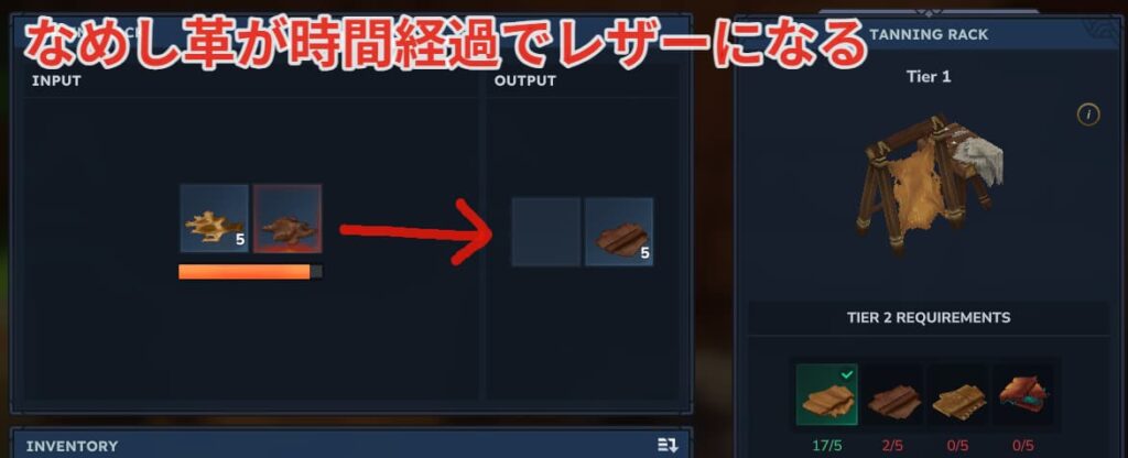 次に日焼けラックに手に入れたなめし革をインプットすることで、時間経過でレザーに加工されます。
