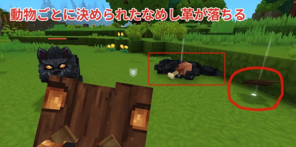 動物ごとに倒すことで決められたなめし革が落ちるので覚えておきましょう。