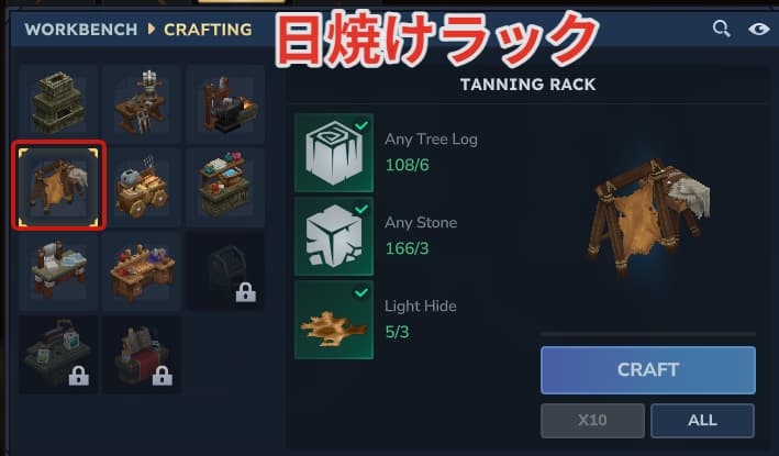 まずワークベンチでTanning rack(日焼けラック)を作成しましょう!素材でライトハイドが必要です。