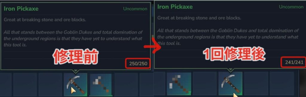 一例で鉄ピッケルの修理前と1回修理後の耐久度ですが、250→241に減少しているのがわかると思います。