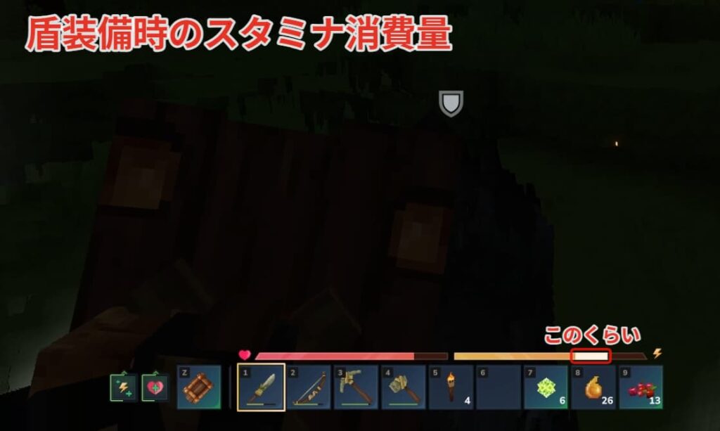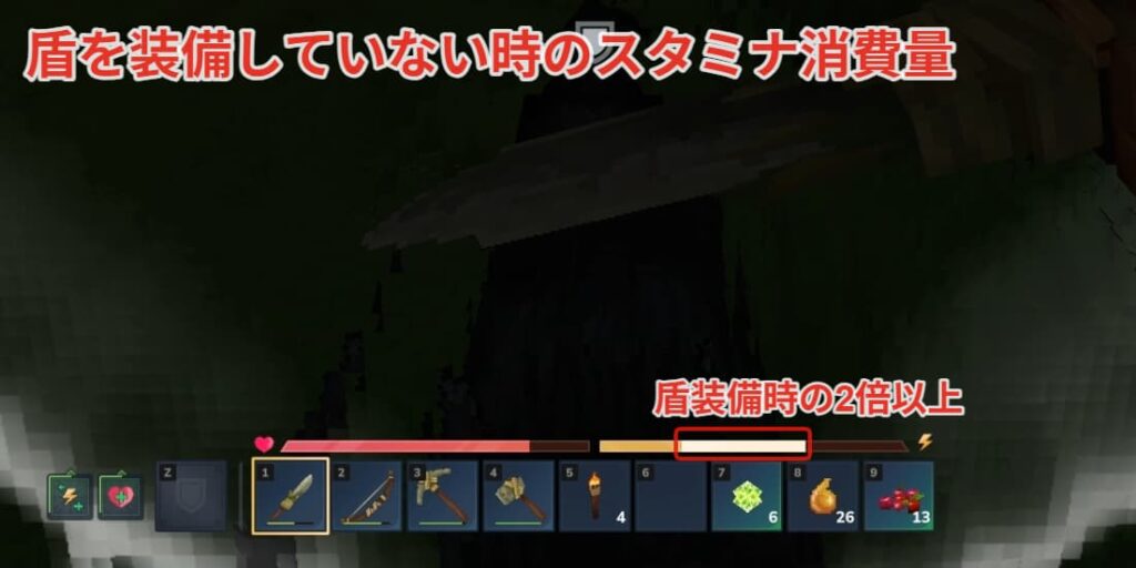 盾を装備するとガード時のスタミナ消費量を大幅に減らすことができます。