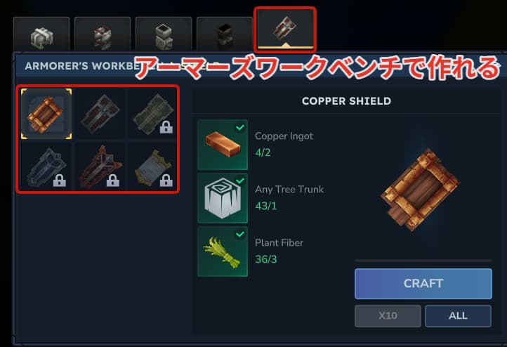 盾はアーマーズワークベンチでのみ製作できる左手用の装備になります。