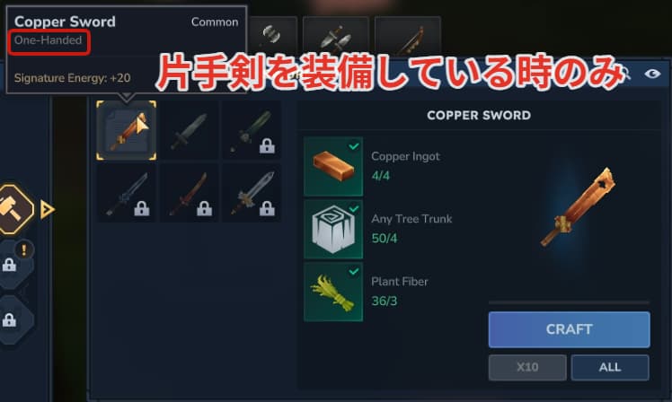 盾を装備するには”One-handed”(ワンハンド)の武器を装備している時のみ使うことができるので、現在は片手剣のみが該当します!