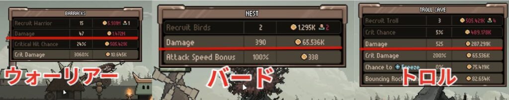 ボスに対して攻撃は基本的にウォーリアー→バード→トロール…と新しい建物で雇える兵士の方が火力が上がっていきます。
