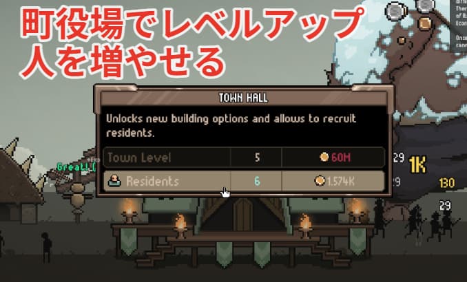 ゲームが始まると最初に建てる町役場はレベルアップで新しい建物をアンロックできるようになります。