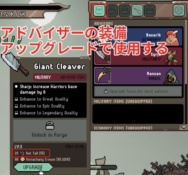 アドバイザーの装備をアップグレードする際に素材を消費します。