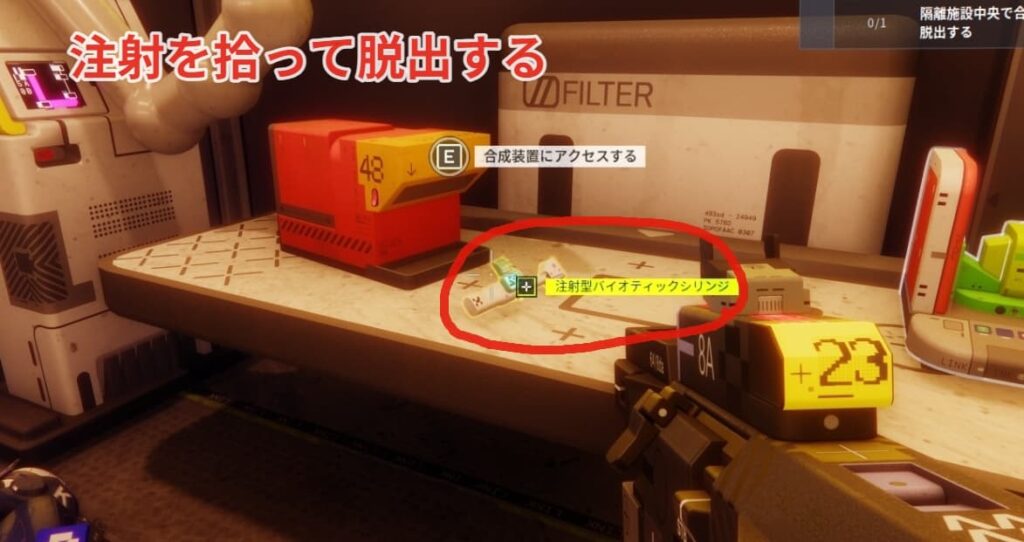 最後に合成装置からでた注射を拾って脱出すればクリアです。(拾うと自動で注射を打つ)