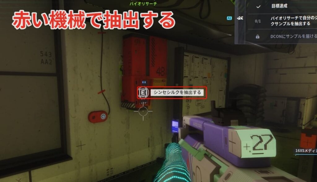目標の部屋に赤い機械があるので抽出しましょう。(ダメージ食らうので注意)