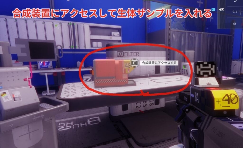 部屋の中に合成装置があるのでアクセスして生体サンプルを入れます。
