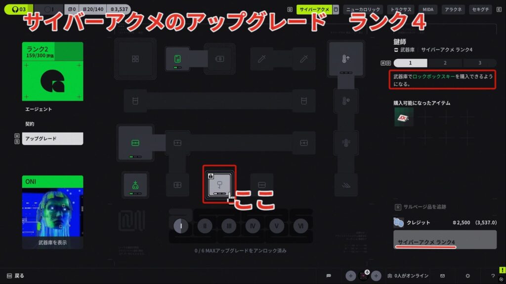 また、サイバーアクメのアップグレードランク4【鍵師】をアンロックすると武器庫で購入できるようになります。