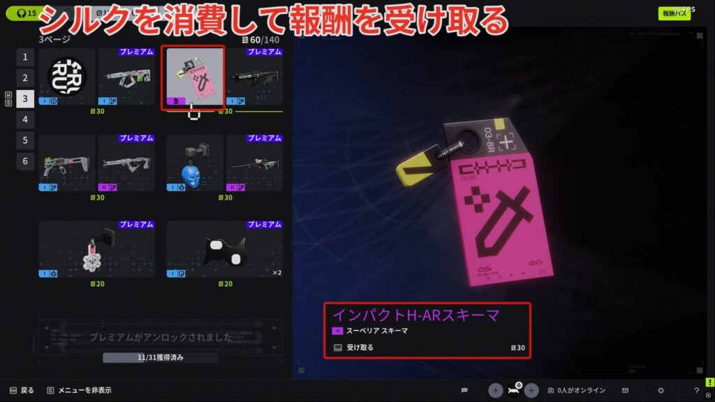 スキーマは報酬パスのラインナップにも並んでいて、シルクを消費して受け取ることができます。
