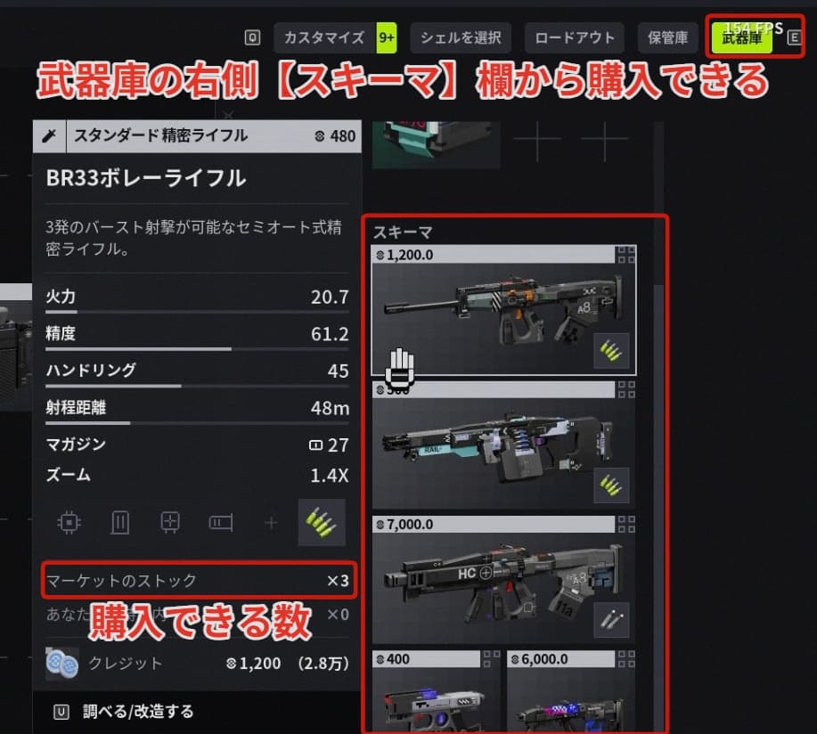 手に入れたスキーマに記載されているアイテムを武器庫のスポンサーキットの下にある【スキーマ】欄でクレジットを消費して購入することができるようになります。