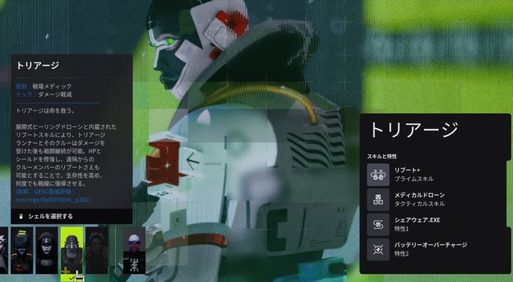 トリアージはPT向けの特性を持っていますが、十分ソロでも活用できるスキルを持っていてお勧めできるランナーシェルです。