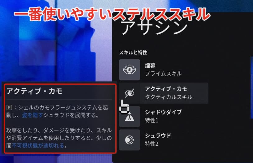 アサシンは不可視状態(ステルス)になることができる2種類のスキルと特性を生かして生存率がとても高く、隠密行動ができるのでソロで一番お勧めできるランナーシェルです。