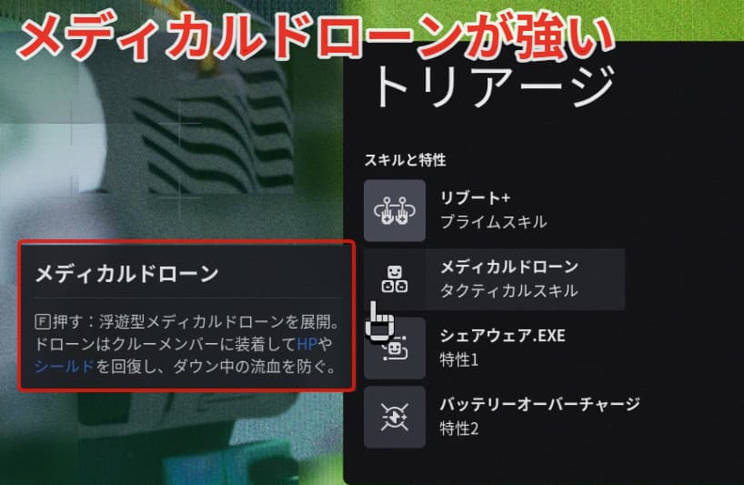トリアージのタクティカルスキル【メディカルドローン】は被弾したHPやシールドを自動で回復してくれる為、戦闘に慣れていない初心者は特にお勧めできます。