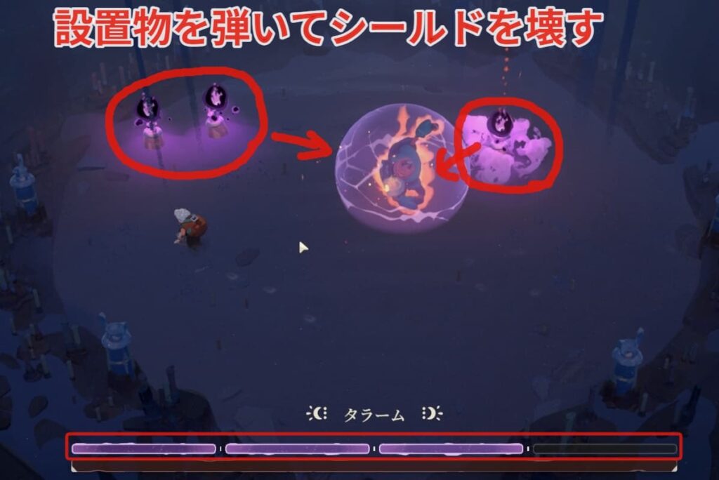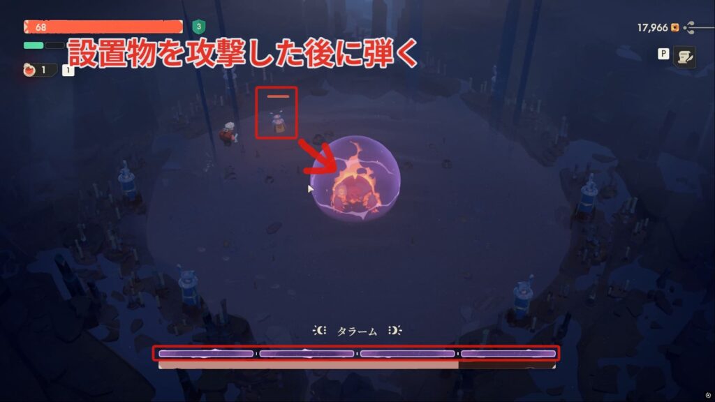 設置物が出現するので、攻撃してHPバーを減らした後に弾いてバリアを削りましょう。