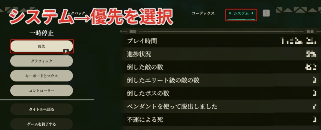 最初に決めた難易度から変更する場合はシステム→優先を選びましょう。