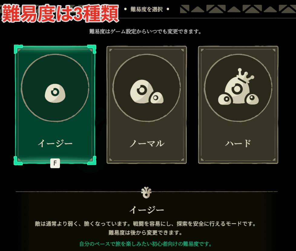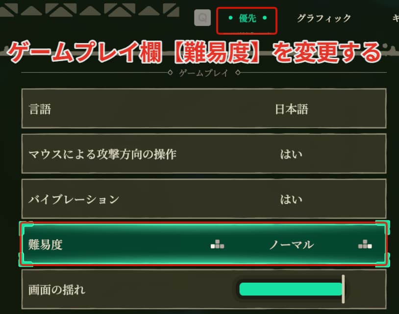 その後ゲームプレイ欄にある【難易度】を変更することでいつでも変えることができます。