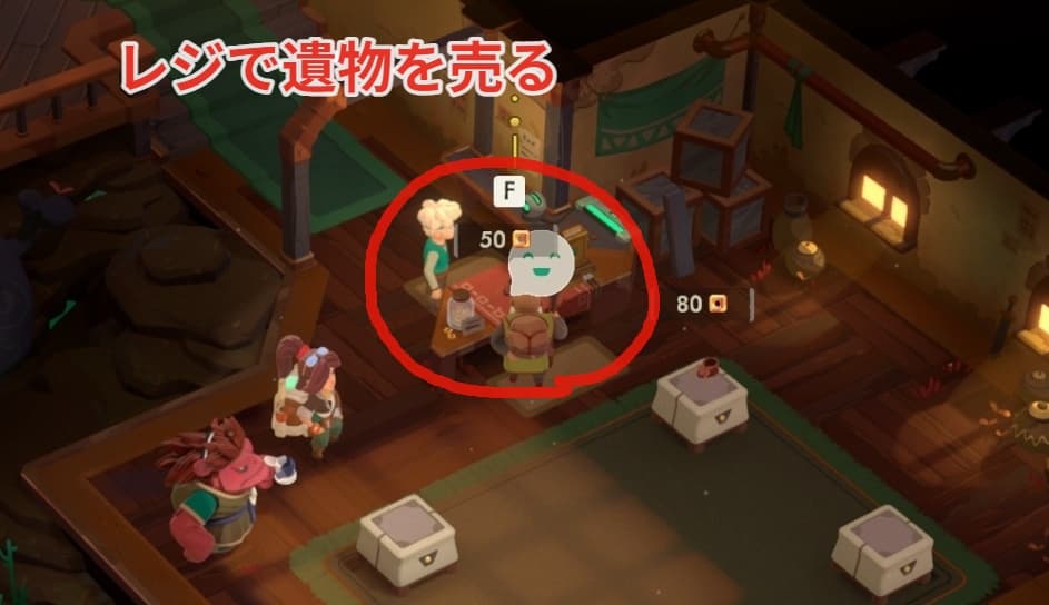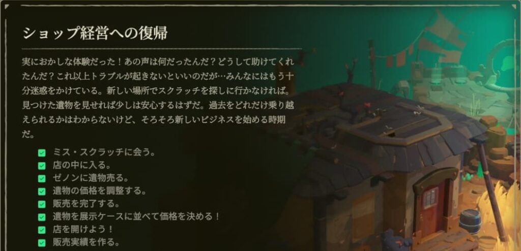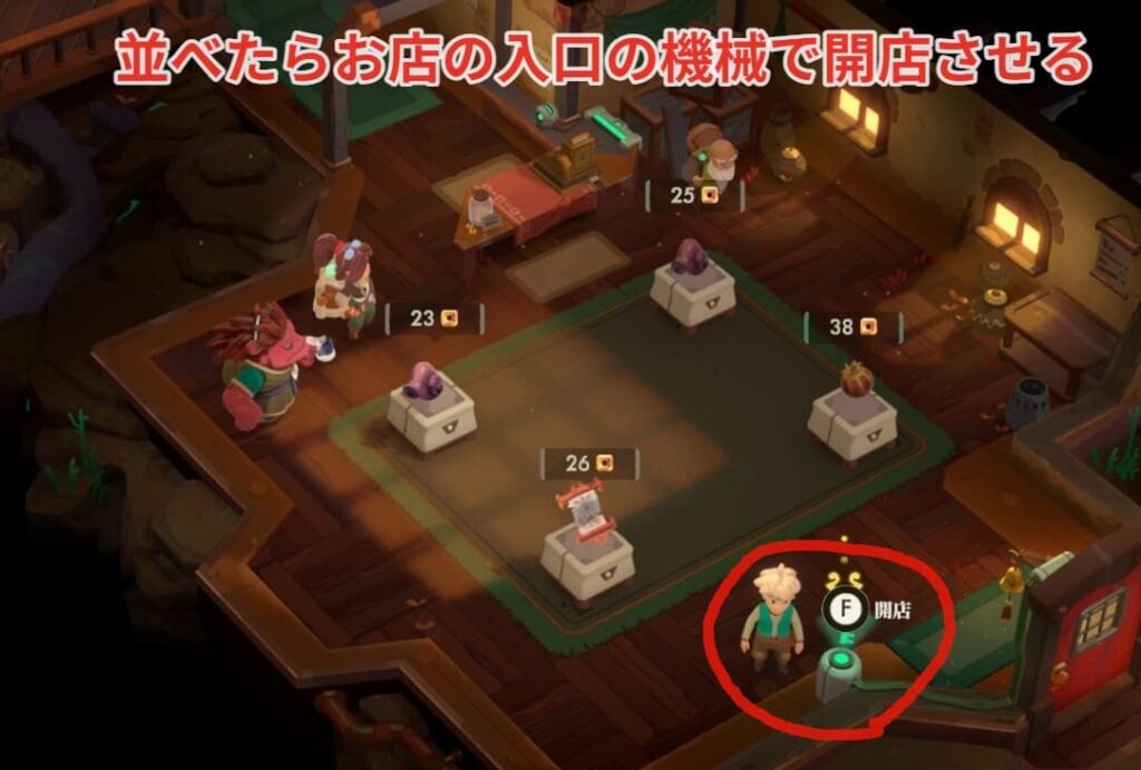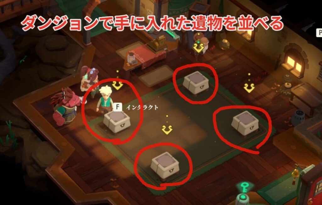 お店に展示ケースが4カ所あるので、ダンジョンで見つけた4つの遺物を価格を決めて並べましょう。