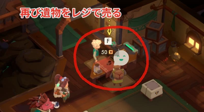 お店に入ったらクエストが進んでゼノンに遺物(靴)を売ることになります。