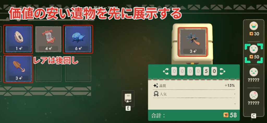 - ②展示ケースに並べる順番は価値の安い遺物から(メーター稼ぎ)
