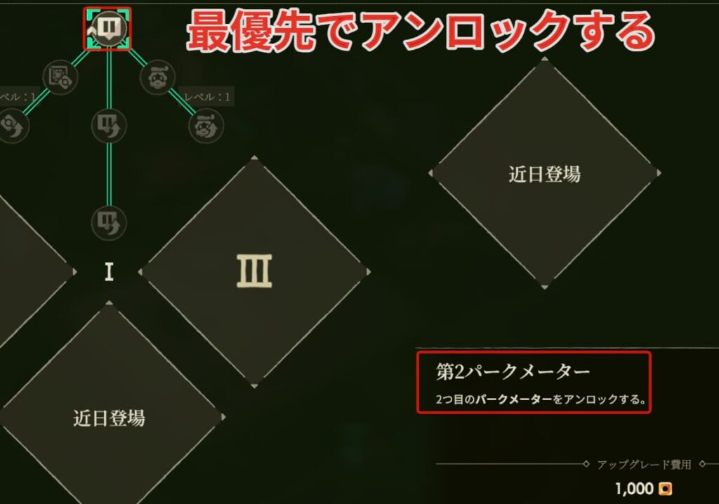 お店の商人の進行度で一番最初に1000Gでアップグレードできる【第2パークメーター】を真っ先にアンロックしていきましょう。