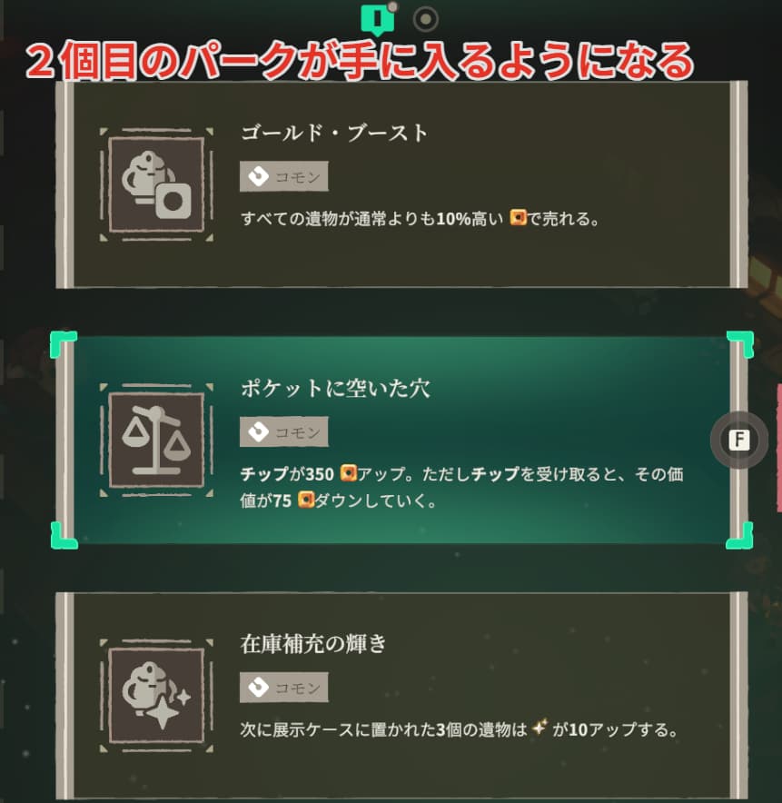 パークによっては10%売却額upなど、価値の高い遺物を残した方が稼ぎやすいです。