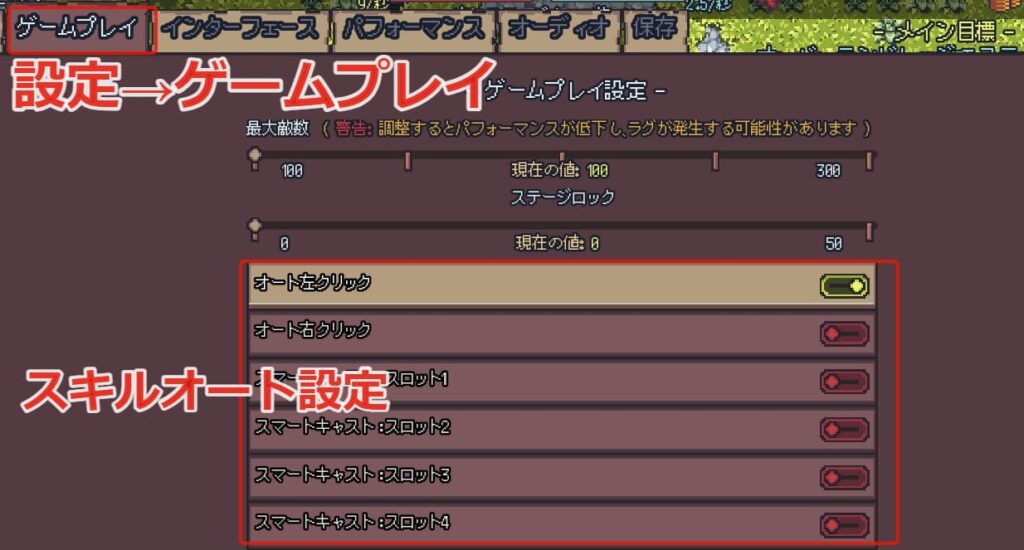 スキルのオート機能は設定→ゲームプレイで変更可能です。