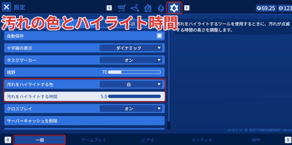 設定で汚れの色とキーボードQキーで表示できる汚れのハイライト時間を設定できます。