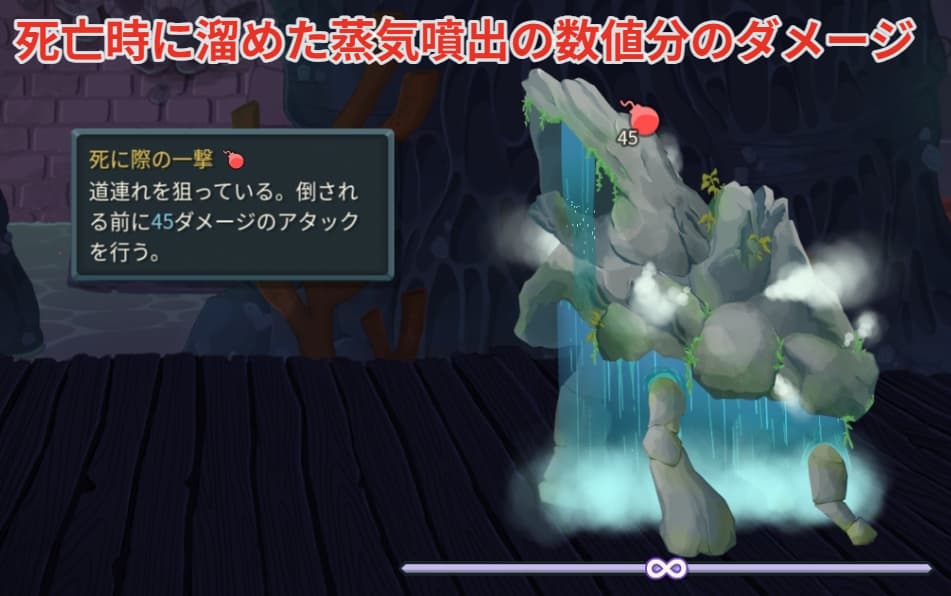 滝の巨人は【蒸気噴出 】と呼ばれる死亡時に道連れにする際に与えるダメージを毎ターン3ずつ溜めていきます。