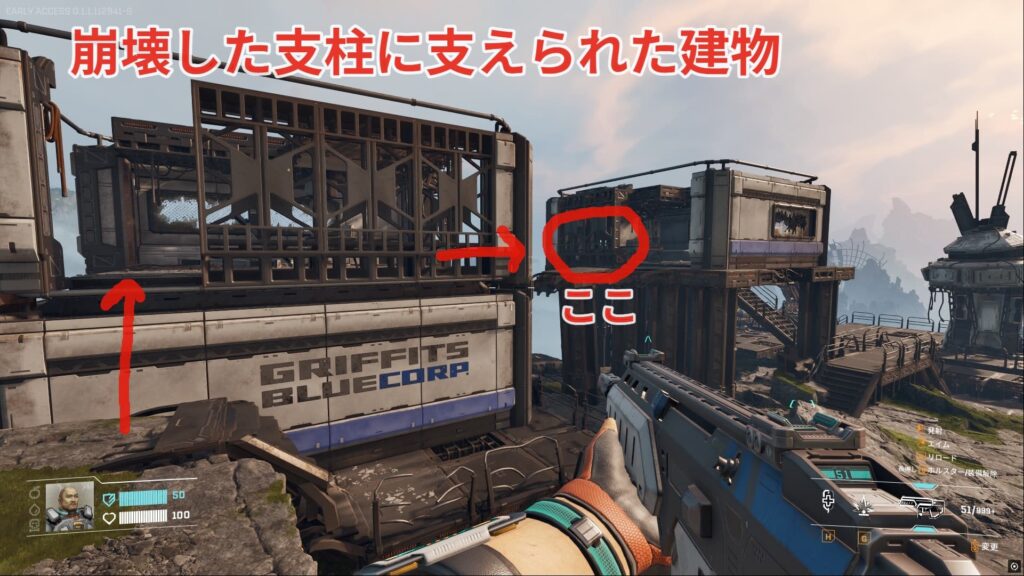 ポツンと崩壊した建物があるので画像の場所から2階部分に飛び乗りましょう。