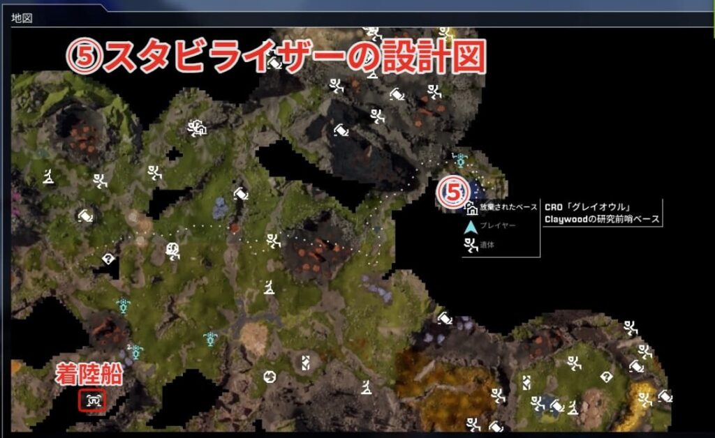 スタビライザーの設計図は着陸船から北西にある放棄されたベースに向かいましょう。
