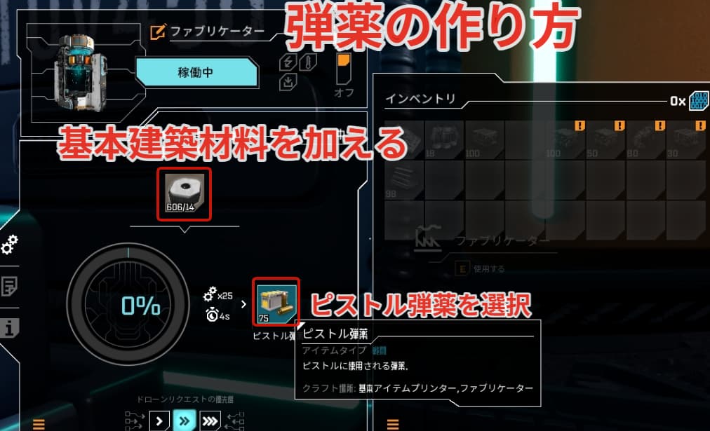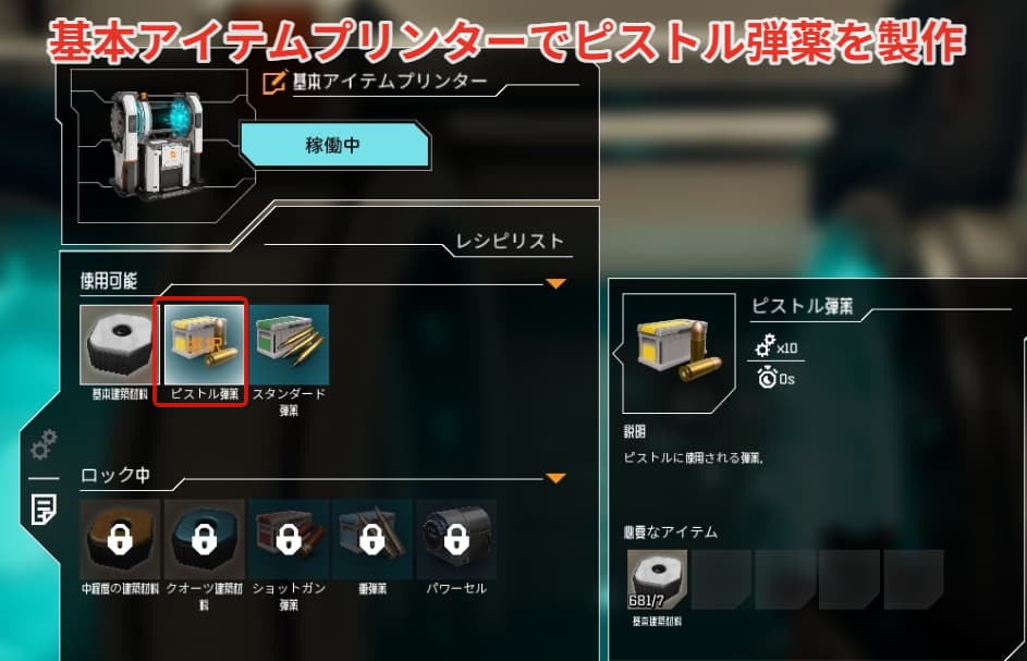 ファブリケーターアンロック後にピストル弾薬を選択し基本建築材料を加えればこちらでも作成できます。