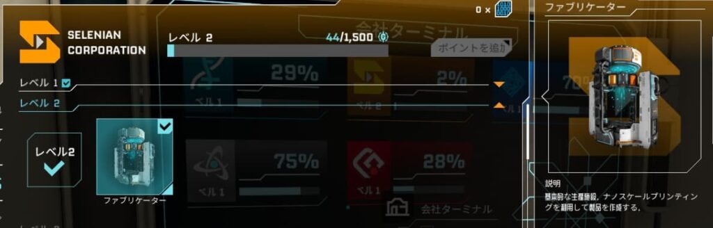 また、黄色会社(SELENIAN CORPORATION)レベル2報酬:ファブリケーターをアンロックしましょう。